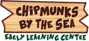 Logo of "Chipmunks by the Sea Early Learning Centre" with wood-style background and playful font.