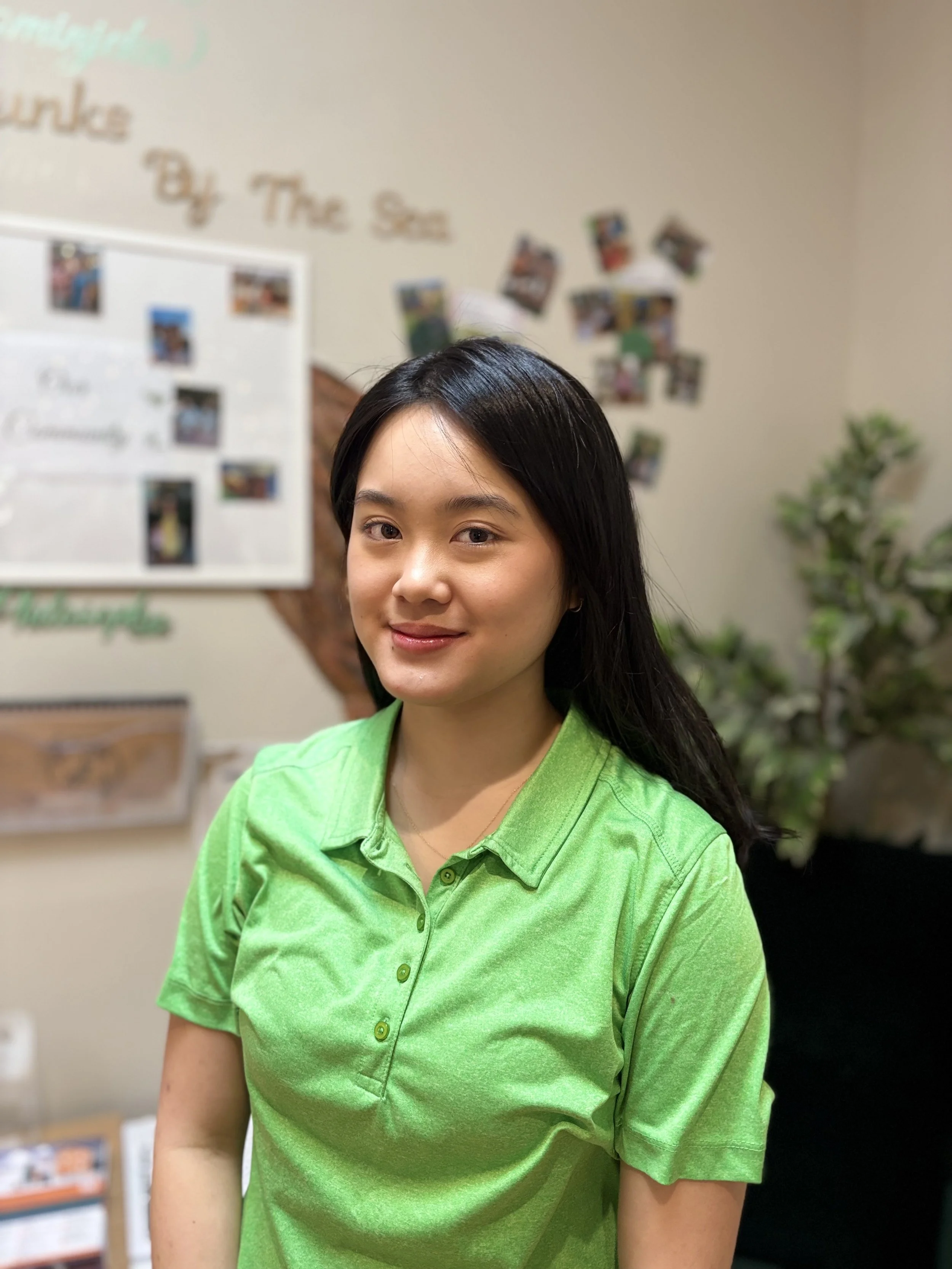 A woman with long black hair and light skin wearing a bright green polo shirt, standing indoors with a blurred background featuring pictures and posters on the wall, a whiteboard, and a potted plant.