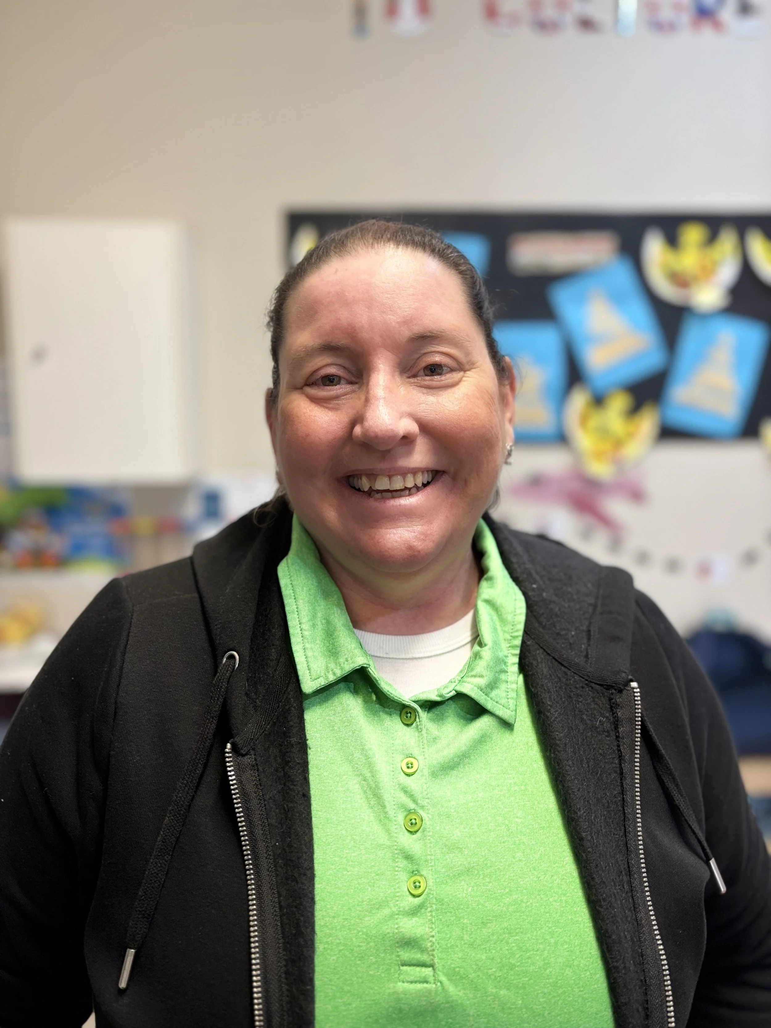 A woman smiling, wearing a green polo shirt and black jacket, standing in a classroom with educational decorations on the wall.